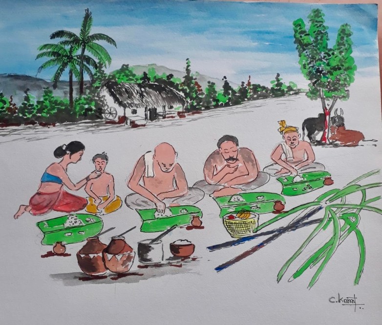இன்று சிற்றூர்களில் காணக்கூடிய, நகரங்களில் அருகிப்போய்விட்ட- வாசலில் இடும் பொங்கலை இது படம்பிடித்துக் காட்டுகிறது இல்லையா! நாள்தோறும் சமைக்கும் உணவு வீட்டுக்குள் இருக்கும் அடுக்களையில் பொங்கப்படும். கொண்டாட்டத்திற்குரிய சிறப்பு நாட்களில் வீட்டு முன்பகுதியில் சோறு பொங்குவது தமிழர் மரபு என்பதை இது காட்டுகிறது. இன்றும் கோயில்களில் விழாநாட்களில் விறகடுப்பில் ஒன்றாக அமர்ந்துப் பொங்கலிடுவதை நாம் இங்கு ஒப்புநோக்கவேண்டும்.
