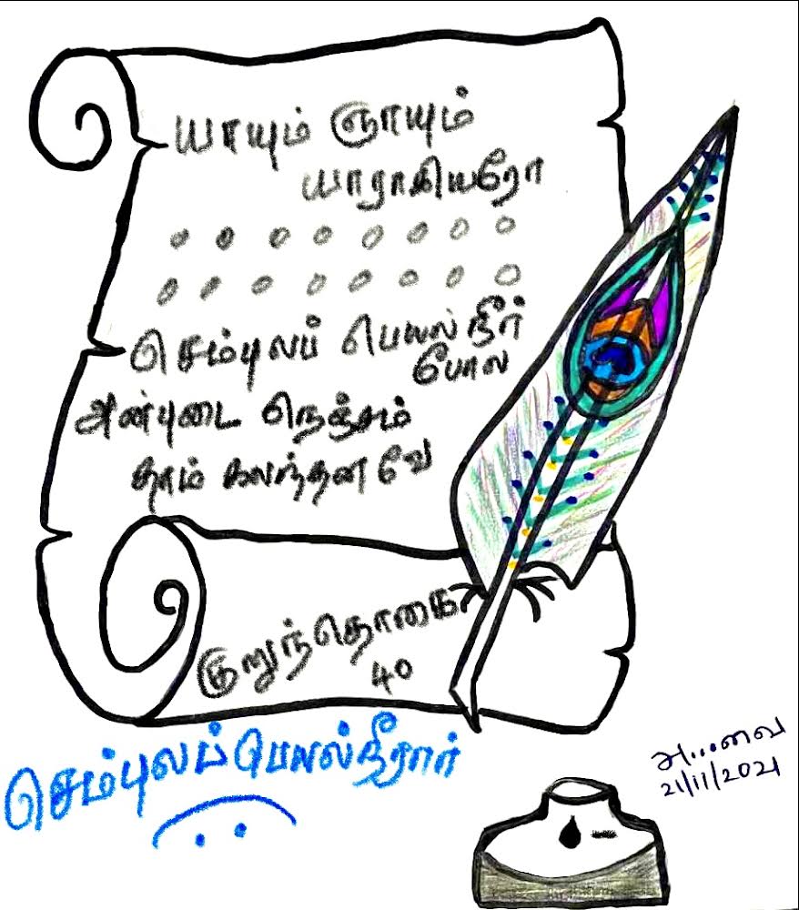 யாயும் ஞாயும் யாராகியரோ?எந்தையும் நுந்தையும் எம்முறைக் கேளிர்?யானும் நீயும் எவ்வழி அறிதும்?செம்புலப் பெயல்நீர்போல அன்புடை நெஞ்சம்தாம் கலந்தனவே (செம்புலப்பெயல்நீரார், குறுந்தொகை 40) எட்டுத் தொகை இலக்கியங்களில் ஒன்றான குறுந்தொகையில் 40ஆவது பாடல் இது. சென்ற பகிர்வில் கண்ட, அங்கவை சங்கவையின் ‘அற்றைத் திங்கள்’ இன்றுவரை நம்மிடையே உலவி வருவது போலவே, கவிஞர்களை மகிழ்வுபடுத்தும் மற்றொரு சொற்றொடர் உண்டு. அதுதான், ‘செம்புலப்பெயல்நீர்’ – இதன் பொருள் – செம்மண் நிலத்தில் விழுந்த நீர்த்துளி . என் தாயும் உன் தாயும் யார் யாரோ, தந்தைமார் இருவரும் உறவினர் அல்லர்; நானும் நீயும் முன்பின் அறியாதவர்கள். அப்படி இருக்க, செம்புலத்தில் விழுந்த நீரைப்போல,”செம்புலப்“செம்புலப் பெயல்நீர் – இன்றும் இனிக்கும் குறுந்தொகைக் காதல்”-ஐ படிப்பதைத் தொடரவும்.